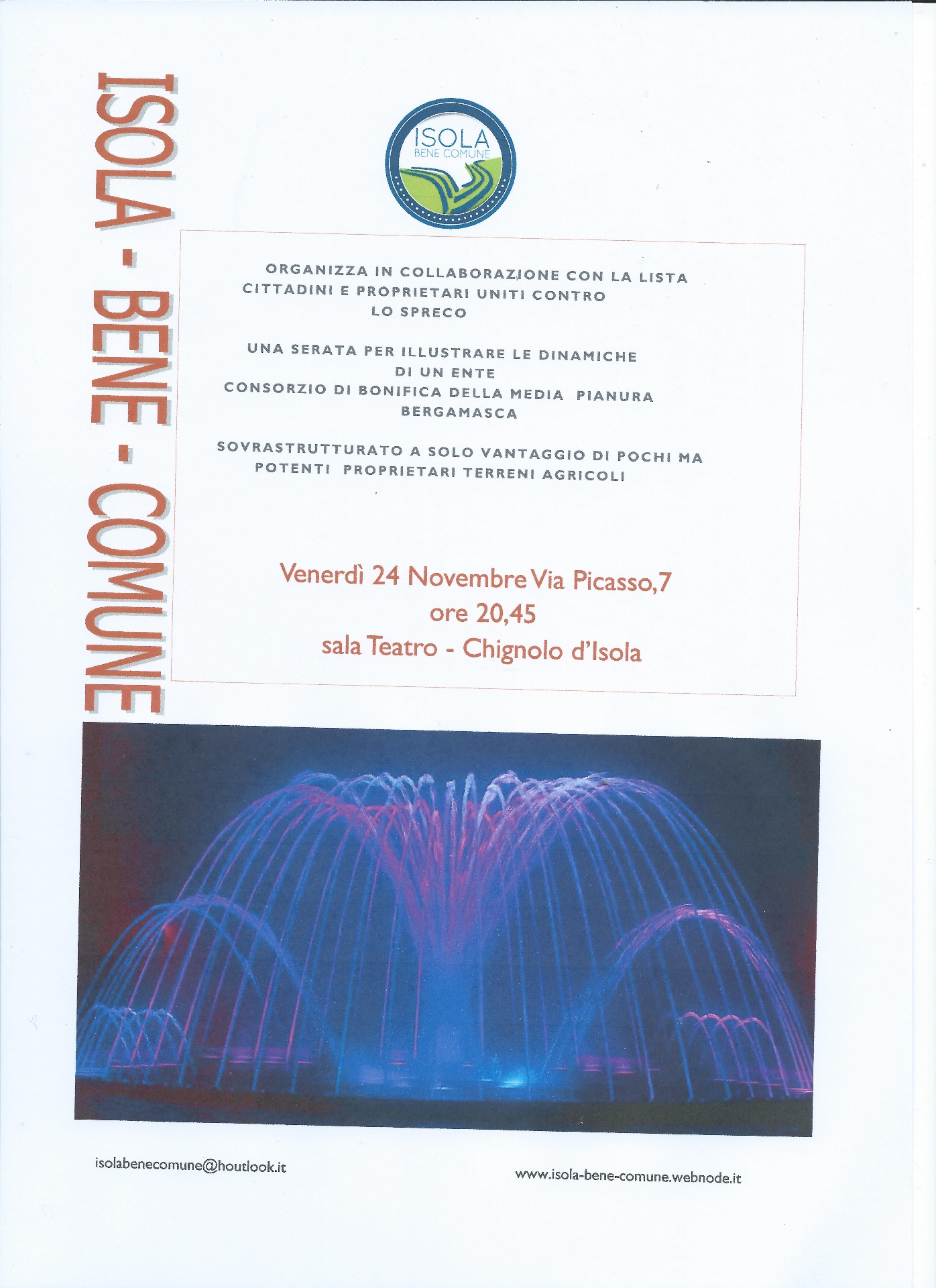 l'associazione Isola Bene Comune nell'informarla che sabato 2 domenica 3 dicembre prossimo, in Via Picasso, Chignolo d'Isola ( Campus Scolastico ) si svolgeranno le consultazioni per il rinnovo del consiglio d'amministrazione del Consorzio di Bonifica della Media Pianura Bergamasca.